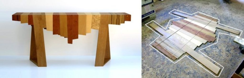 חלקי פלטות MDF. פורמאייקות צבעוניות. סנדוויץ גלוי. עץ מלא. התערוכה "זהמהיש" של אלי צ'יזיק מתבססת על שאריות חומרי גלם שהושלכו מנגריות. תחת ידיו של צ'יזיק האקלקטיקה החומרית של השאריות, לכאורה חסרות הערך, הופכת לפלטות דו מימדיות עתירות גרפיקה וטקסטורות אותן הוא מעצב לאובייקטים תלת מימדיים – פרטי ריהוט עשירים ומוקפדים.